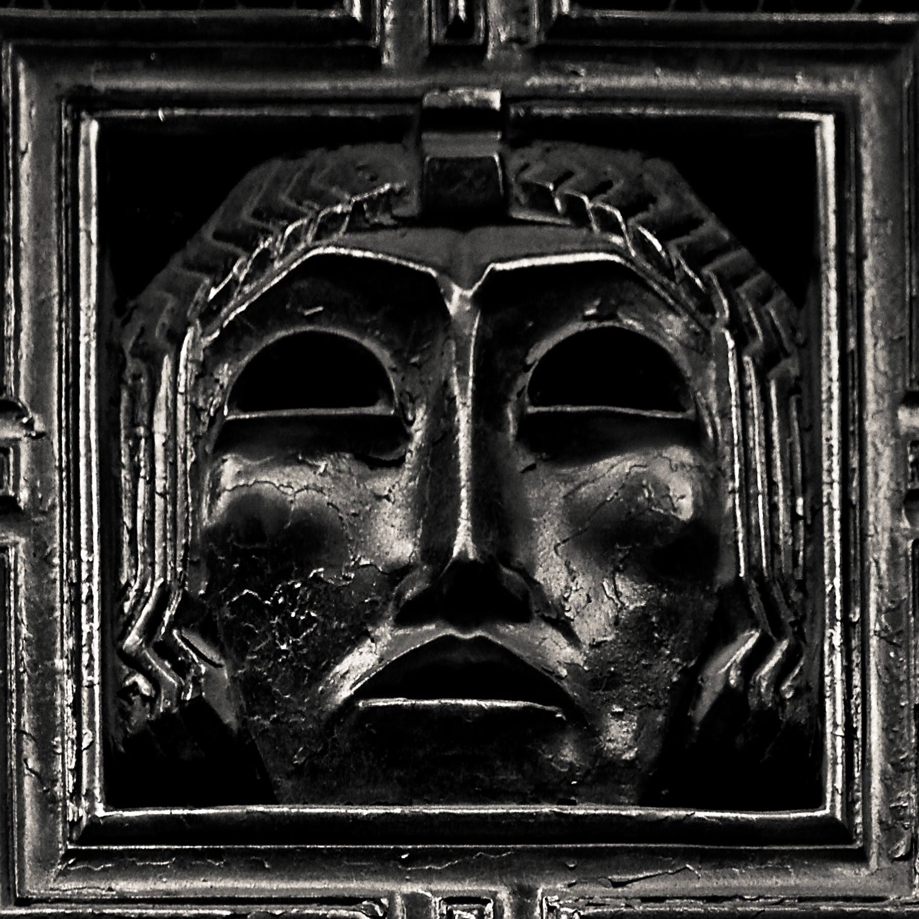I have not come across any information, however, regarding a third mask or expression. I returned to the stage door today to see if maybe this mystery mask was paired with another that I neglected to photograph. But, no. The grating’s design was a pattern having only these three expressions.