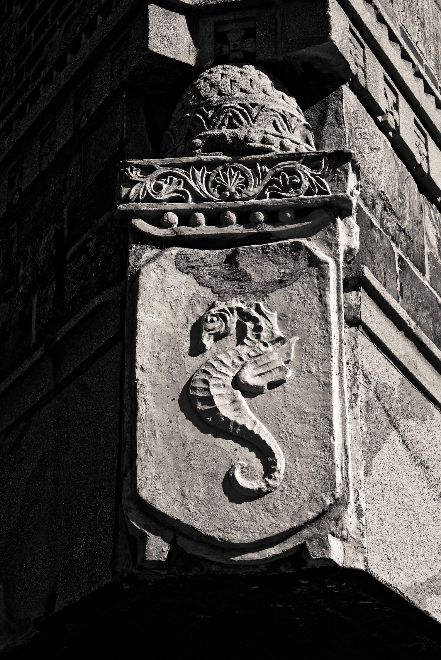 So this time, I notice a large stone emblem of a seahorse above the doorway. There was lots of sunshine that helped accentuate the depth of the relief sculpture as well as the rough textures of the stone and patchwork repairs.
